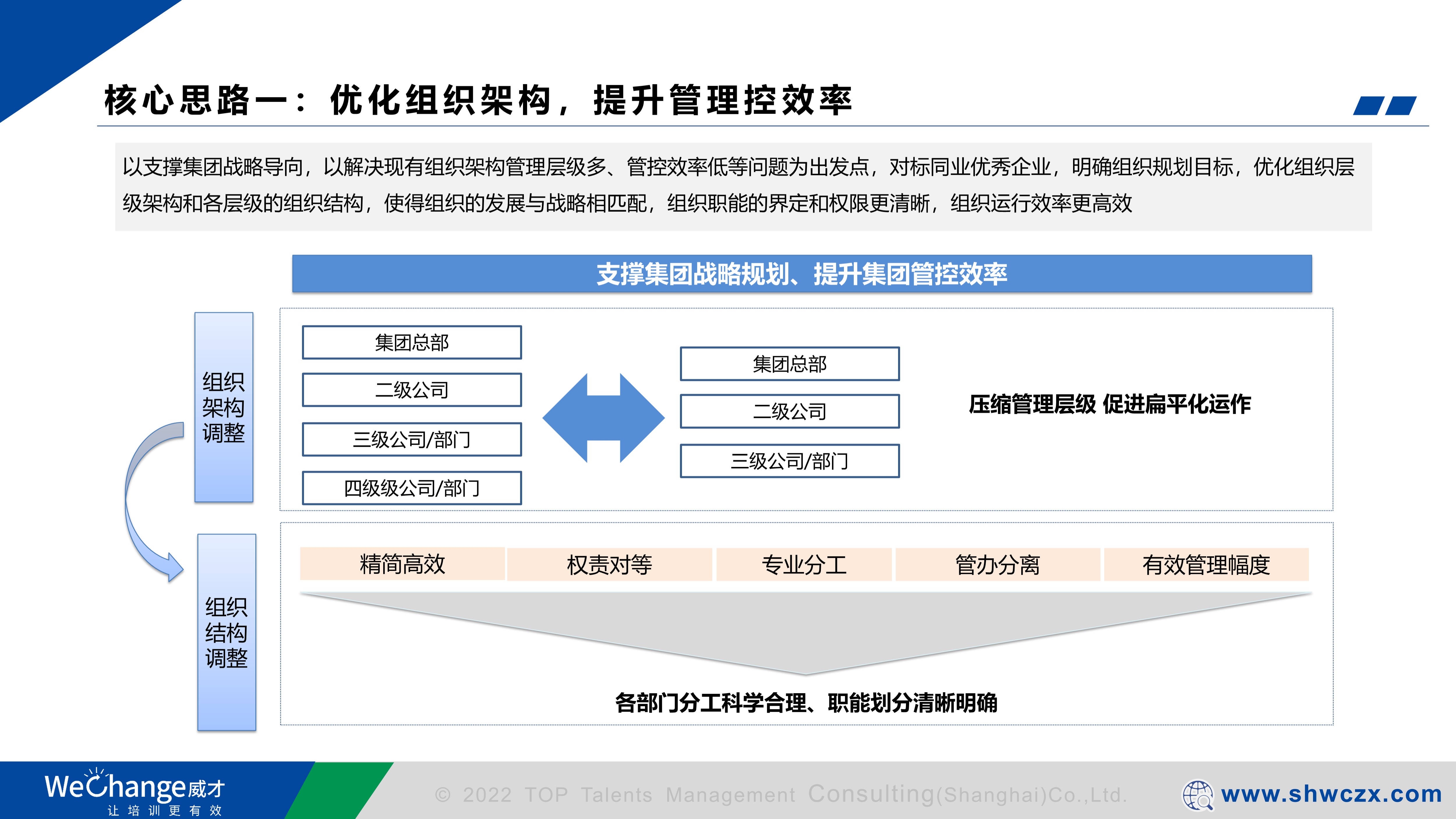 1、以支撐集團(tuán)戰(zhàn)略導(dǎo)向,以解決現(xiàn)有組織架構(gòu)管理層級多、管控效率低等問題為出發(fā)點(diǎn),對標(biāo)同業(yè)優(yōu)秀企業(yè),明確組織規(guī)劃目標(biāo),優(yōu)化組織層級架構(gòu)和各層級的組織結(jié)構(gòu),使得組織的發(fā)展與戰(zhàn)略相匹配,組織職能的界定和權(quán)限更清晰,組織運(yùn)行效率更高效;